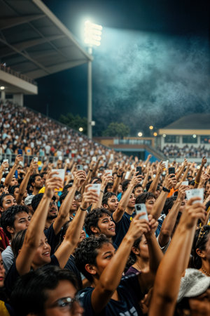 An enthusiastic audience is captured during a performance, illuminated by vibrant stage lighting. Hands reach towards the stage, while individuals record the event with their phones. The composition features a mix of colors and textures, suggesting a lively and energetic atmosphere suitable for various media applications.