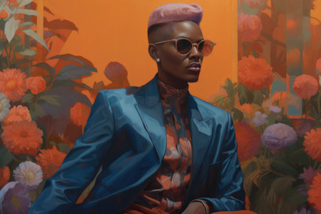 A man poses confidently with sunglasses on, showcasing a fashionable outfit against a backdrop of vivid colors and artistic lighting. The setting reflects a contemporary and creative atmosphere
