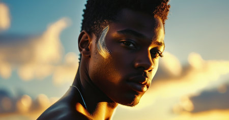 A captivating portrait of a young man adorned with intricate tattoos, showcasing personal expression and cultural heritage, captured in soft, warm lighting.