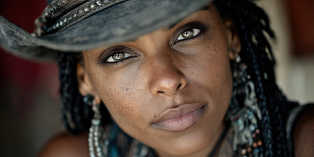 Confident African American woman with braids and a cowboy hat, displaying her striking features and unique style, set against a rustic background with natural light