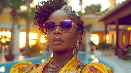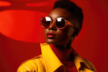 Stylish portrait of a Black woman in vibrant attire, wearing round sunglasses against a colorful geometric background.