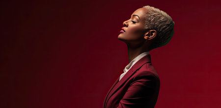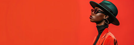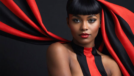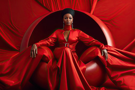 The black woman model showcases a bold red outfit, highlighting her elegant hairstyle and accessorizing with large earrings.