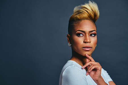 Portrait Of a very confident Young woman with cool short hair and looking to side at copy space thinking