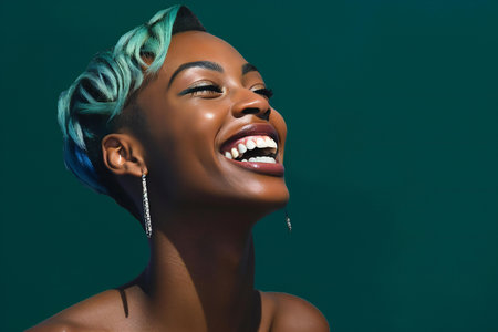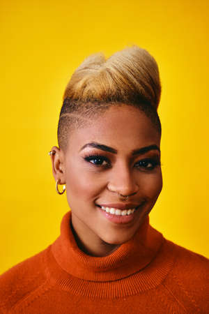Portrait of a smiling young woman with cool hair Against Yellow Background