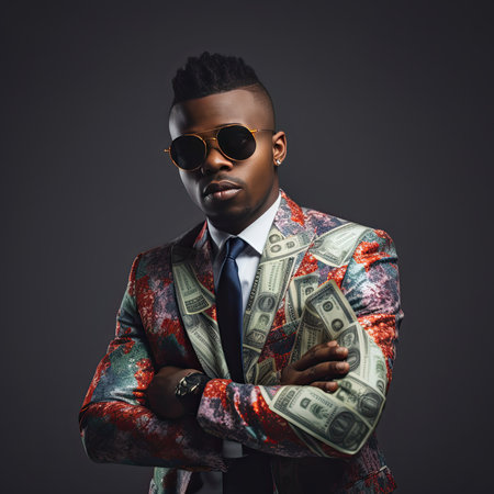 a man in a suit and sunglasses, with money on his lape photo courtesy from shutterstocker com. Generative Ai
