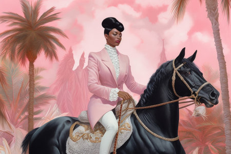 African American female equestrian on horseback for show jumping. Concept of horse rider, competitive sport, equestrian elegance. Vertical.
