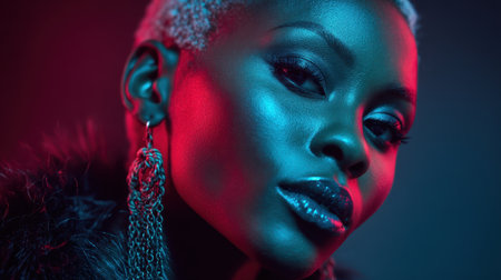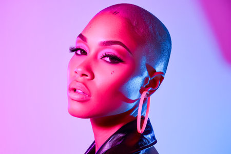 Fashionable Portrait of Bald Female Model with Earrings in Neon Light AI Generative