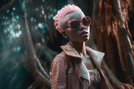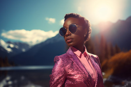 Fashionable African woman posing in mountain. Black model wearing modern sunglasses. Generate ai