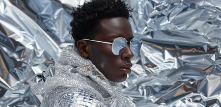 A man in a silver jacket and sunglasses looks off into the distance. He is standing in a field of shiny, reflective material.