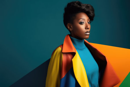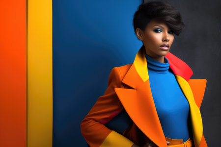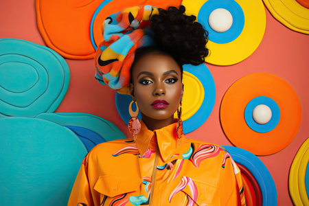 Beauty young african american girl in fashion clothing posing colorful background. Generative AI.