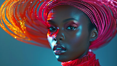 A striking portrait of a woman wearing an elaborate, colorful hat and makeup, illuminated with vibrant lighting, showcasing modern fashion and artistic expression.