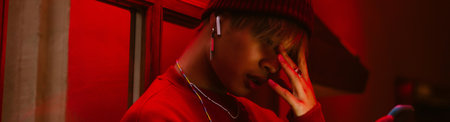 young stylish african american man in futuristic sunglasses posing on pink in blue light
