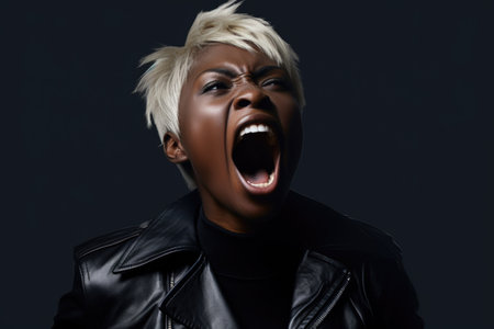 A picture of a woman wearing a leather jacket with her mouth open. This image can be used to portray surprise, shock, or excitement. Ideal for websites, blogs, or articles related to fashion, emotions, or expressive portraits.