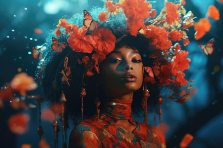 Art portrait of a beautiful dark-skinned girl with flowers and butterflies in her hair on a turquoise background