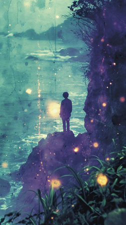 A young man looks upward at a vibrant night sky filled with sparkling lights and soft clouds.