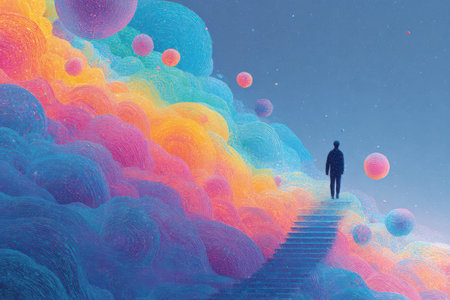 Individual standing on a staircase surrounded by vibrant, abstract spheres in a cosmic setting