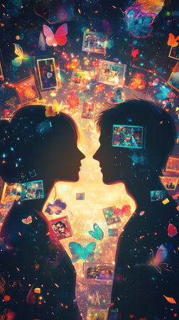 Silhouettes of a couple stand close together, facing one another. The background is filled with colorful butterflies and floating memories, creating a magical atmosphere.