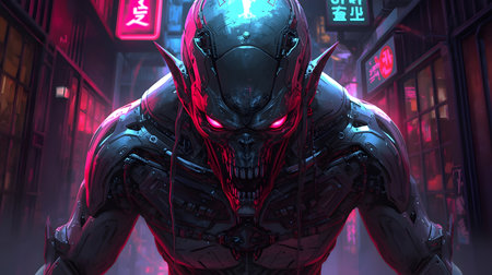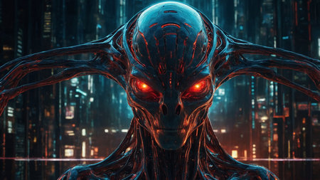 Cyborg alien with a futuristic look in a neon-lit cityscape. Concept of sci-fi, technology, extraterrestrial life, and cyberpunk culture.
