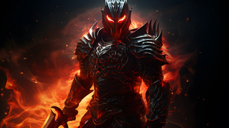 Demon in fire on black background. Fantasy and fairy tale concept.