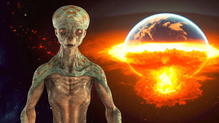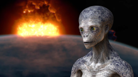 Humanoid alien on background with bursting Earth planet, conceptual 3D illustration