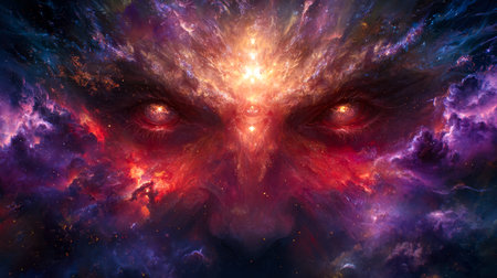 An otherworldly visage emerges within a vibrant nebula, eyes radiating luminescence, blending cosmic mystery and vivid hues in a dreamlike scene.