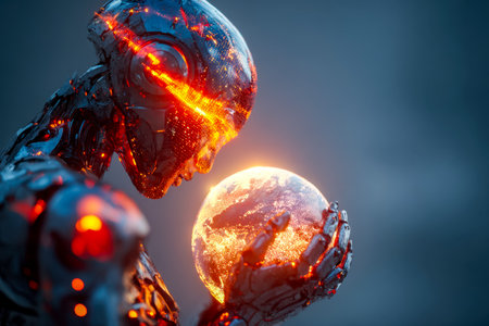 A sleek, advanced android cradles a luminous, planet-like orb, emphasizing innovation's potential in safeguarding and nurturing the world's future.