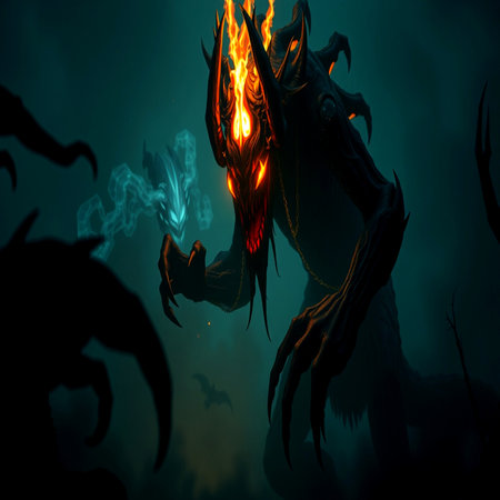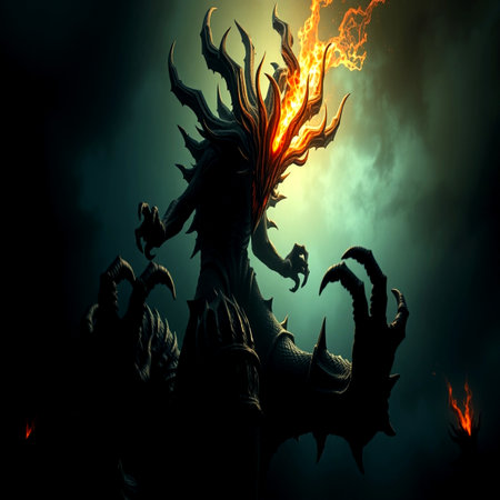 A fearsome entity stands tall amidst flames and smoke, surrounded by a dark, surreal atmosphere.