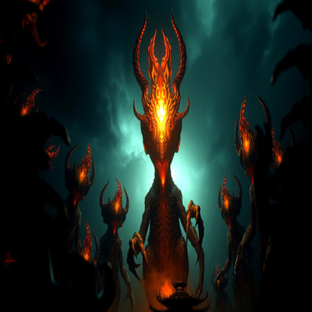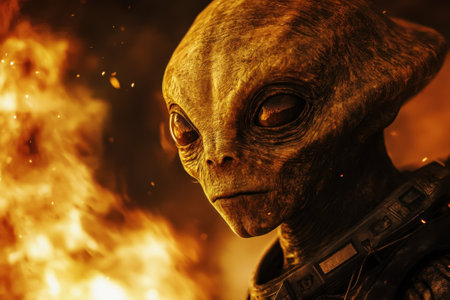 An alien figure with distinct features gazes intently while flames illuminate the surroundings.