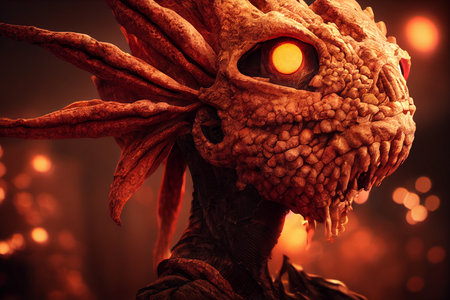 Artwork of a hellish demon creature face profile with glowing eyes close up standing on inferno fire background.