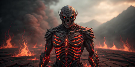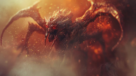 Demonic monster beast with glowing red eyes in a fiery background. Concept of horror creature, evil, Halloween, and fantasy.