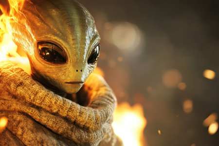 A green extraterrestrial being gazes intently, enveloped by flames while wearing a warm, textured wrap.