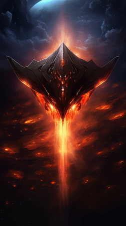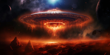 Futuristic spaceship in the fire. Futuristic alien spaceship flying in deep space with planets. Flying saucer in the night sky. Fantasy. Transport of the future. Digital art