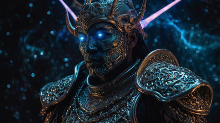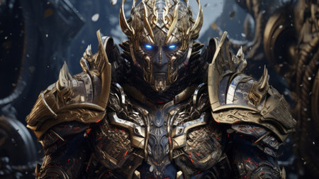 the character design of k showcases intricate armor details against an epic unsplash backdrop. the chaotic background adds a dynamic element to this visually striking image, making it a captivating piece for fantasy enthusiasts and digital art lovers. ai generated