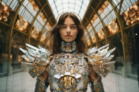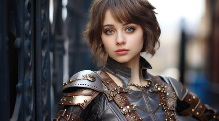 photo of strong ancient young female warrior with roman armor stained, generative AI