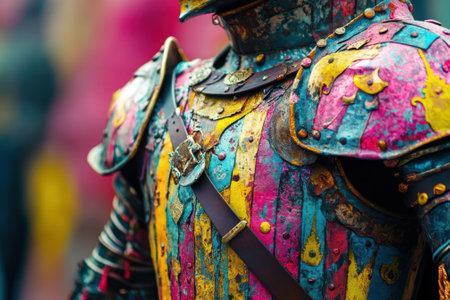 Brightly colored medieval armor showcases craftsmanship during a lively historical festival in the countryside.