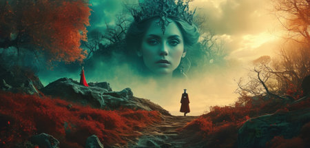 3d illustration of a beautiful woman in a fantasy landscape with a crown on her head