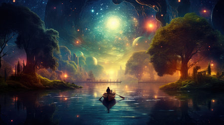 A woman radiates a mystical glow, her flowing hair transformed into ethereal streams of color resembling a cosmic landscape. A starry night enhances the enchanting atmosphere.