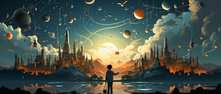 A captivating illustration symbolizing education's vast possibilities, featuring a child gazing at a magical landscape filled with planets and a vibrant sunset.