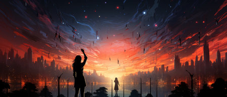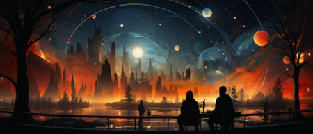 A digital art fantasy scene featuring a silhouette of a tree and two figures under a colorful cosmic sky with nebula and of stars.