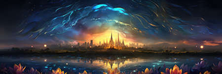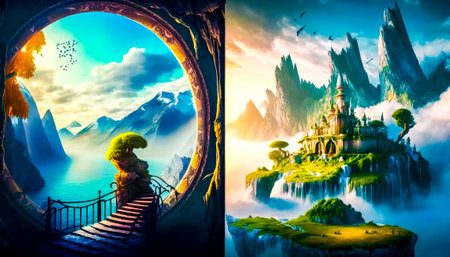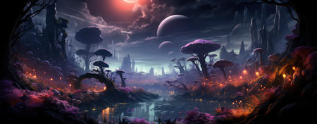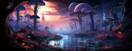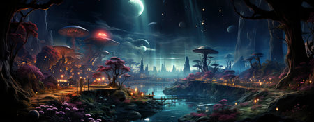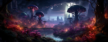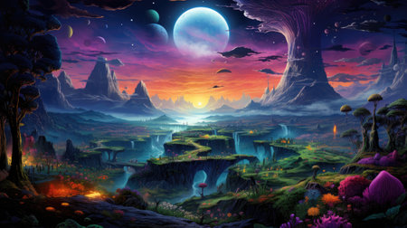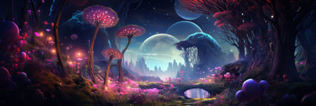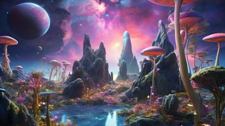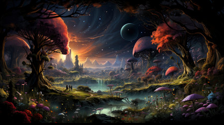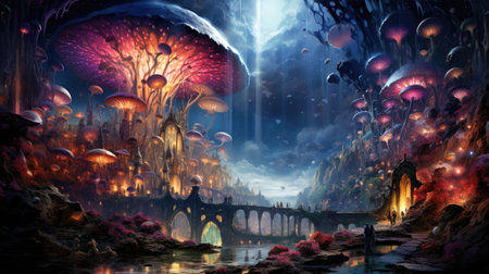 An AI generated illustration of a vibrant, colorful picturesque fairy tale landscape with fungus