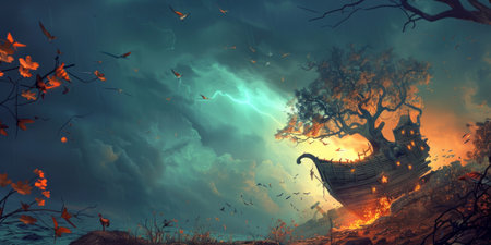 A vibrant, fiery abstract landscape that evokes a sense of dynamic movement and fantastical wonder