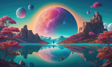 Fantasy landscape with fantasy planet and lake. 3d illustration.