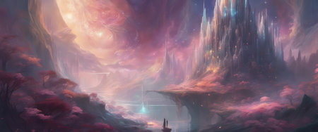 A mesmerizing fantasy landscape featuring a majestic castle amidst glowing flowers and ethereal mountains, creating a dreamlike atmosphere of magic and wonder.