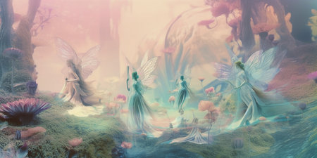 abstract fairies in the valley of the fairies with flora in pastel colors, illustration