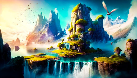 Fantasy landscape with waterfall and birds flying over it. Generative AI.