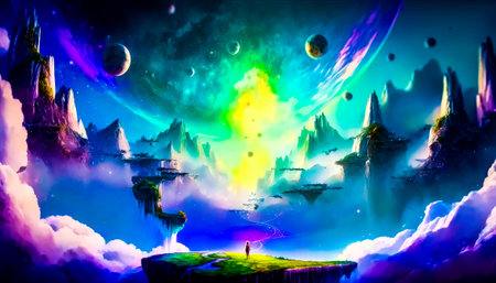Breathtaking cosmic landscape featuring twin towers amid vibrant celestial bodies. This stunning artwork conveys a sense of adventure and tranquility in a surreal night sky.