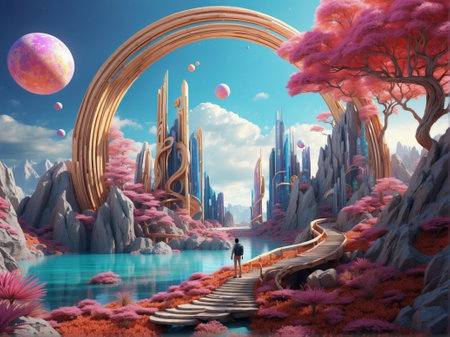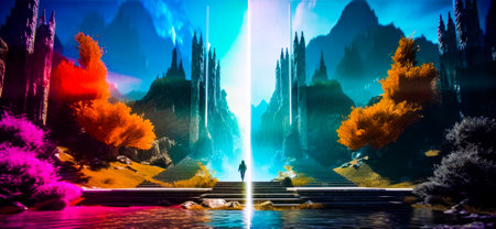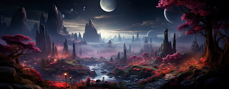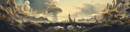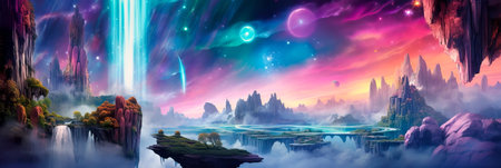 A technologically-charged metaverse. Landscape with science fiction mountains, rivers and clouds.