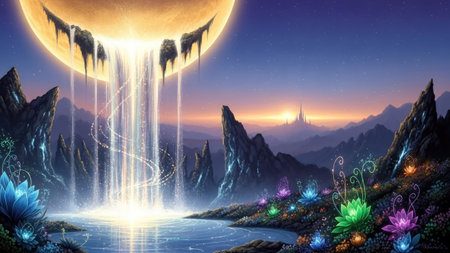 An illustration depicts a fantastic landscape featuring a cascading waterfall flowing from a radiant moon. The scene is bathed in a twilight palette of blues and purples, with soft textures and ethereal lighting. The composition suggests a serene environment suitable for various creative projects and visualizations.