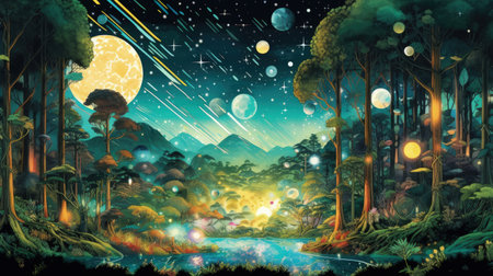Mystical forest landscape with glowing flora, serene water, and floating orbs under a starry sky