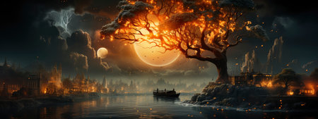 Fantasy fantasy landscape with a boat and mountains. 3d rendering